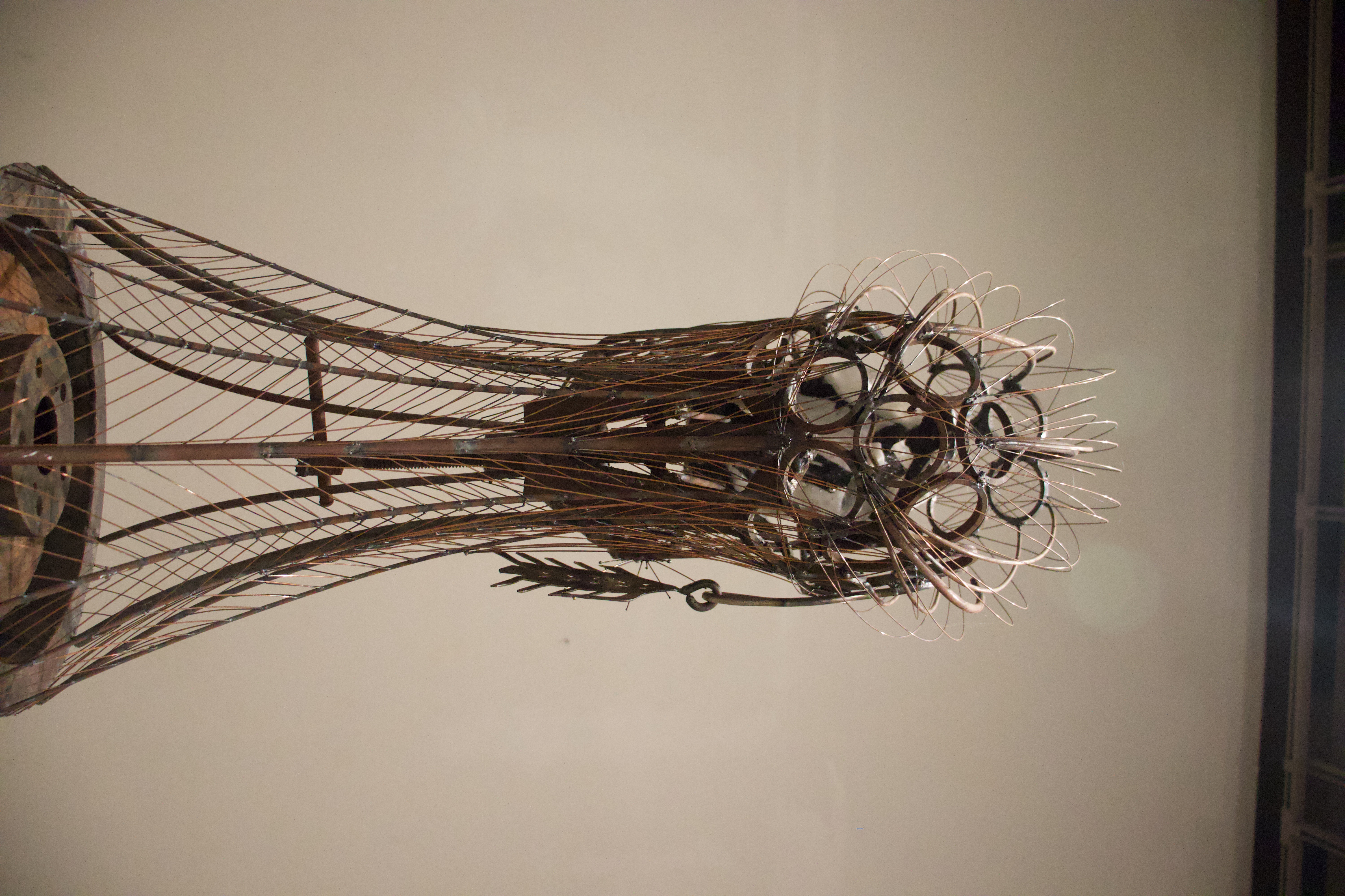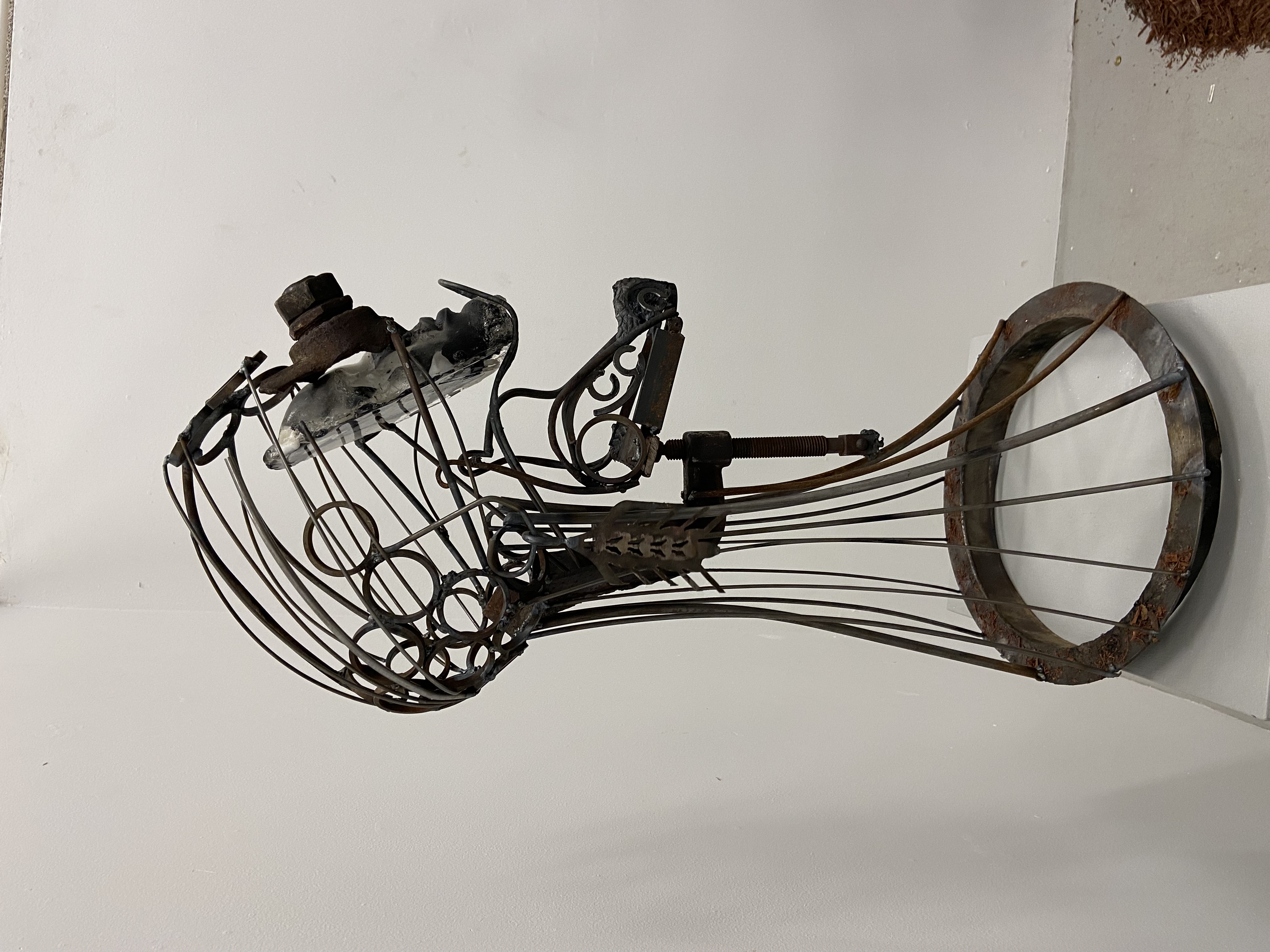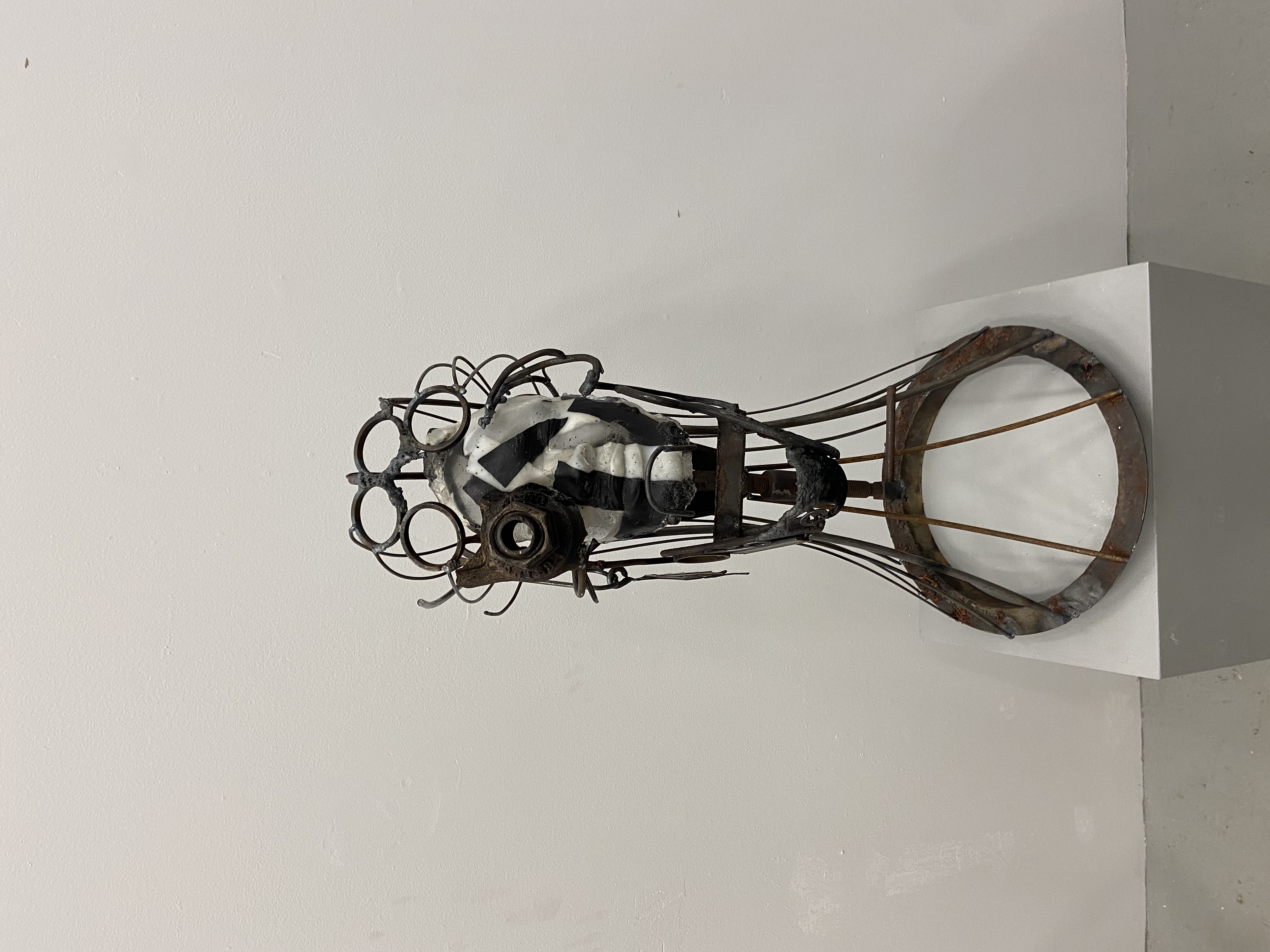 Circular steel elements frame the crown, while tensioned rods draw the form upward from the base. The face sits within a scaffold of metal, held in place through balance and compression. The work examines how identity can be built through accumulation of fragments, hardware, and restraint. What appears cohesive is the result of measured force and structural alignment.