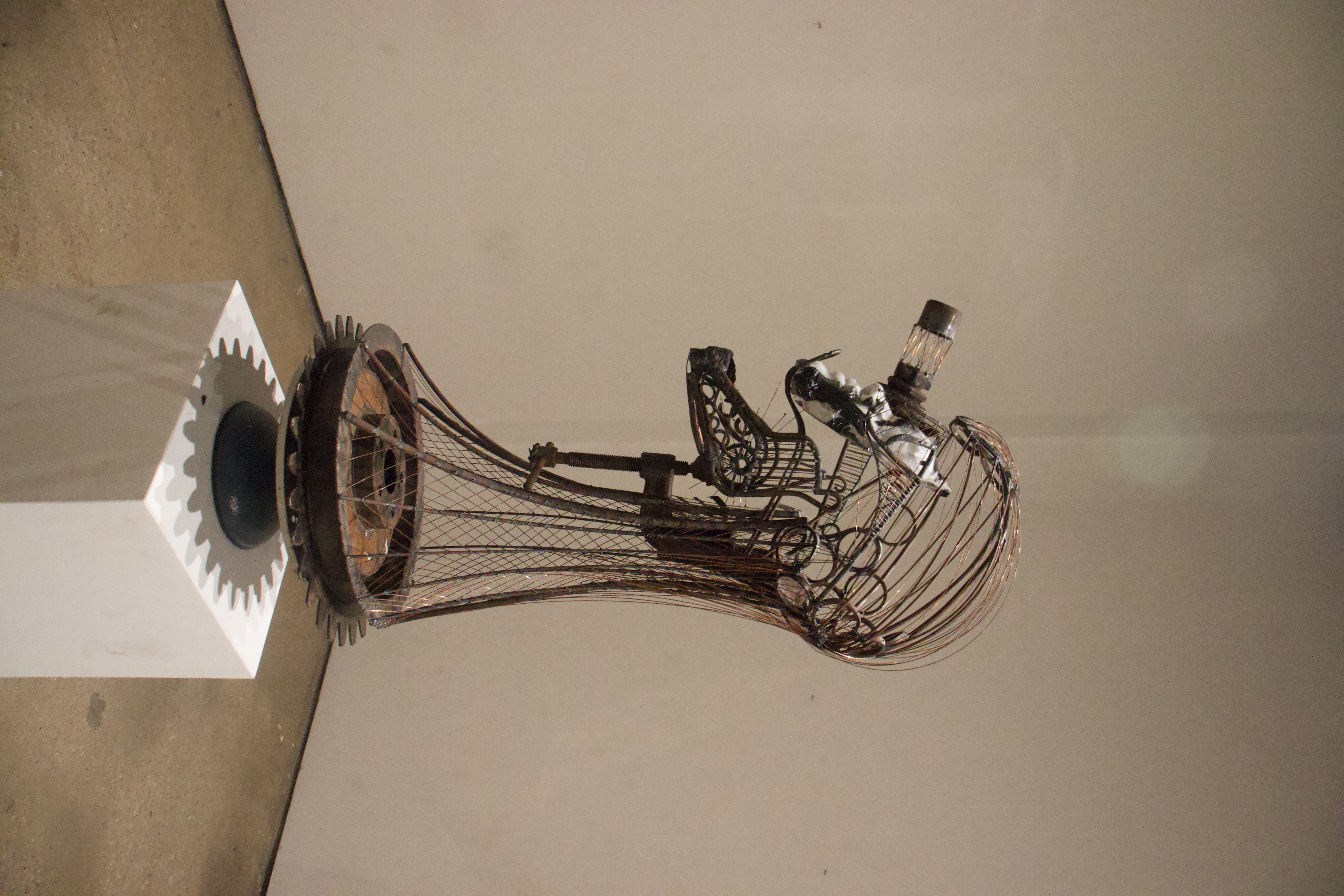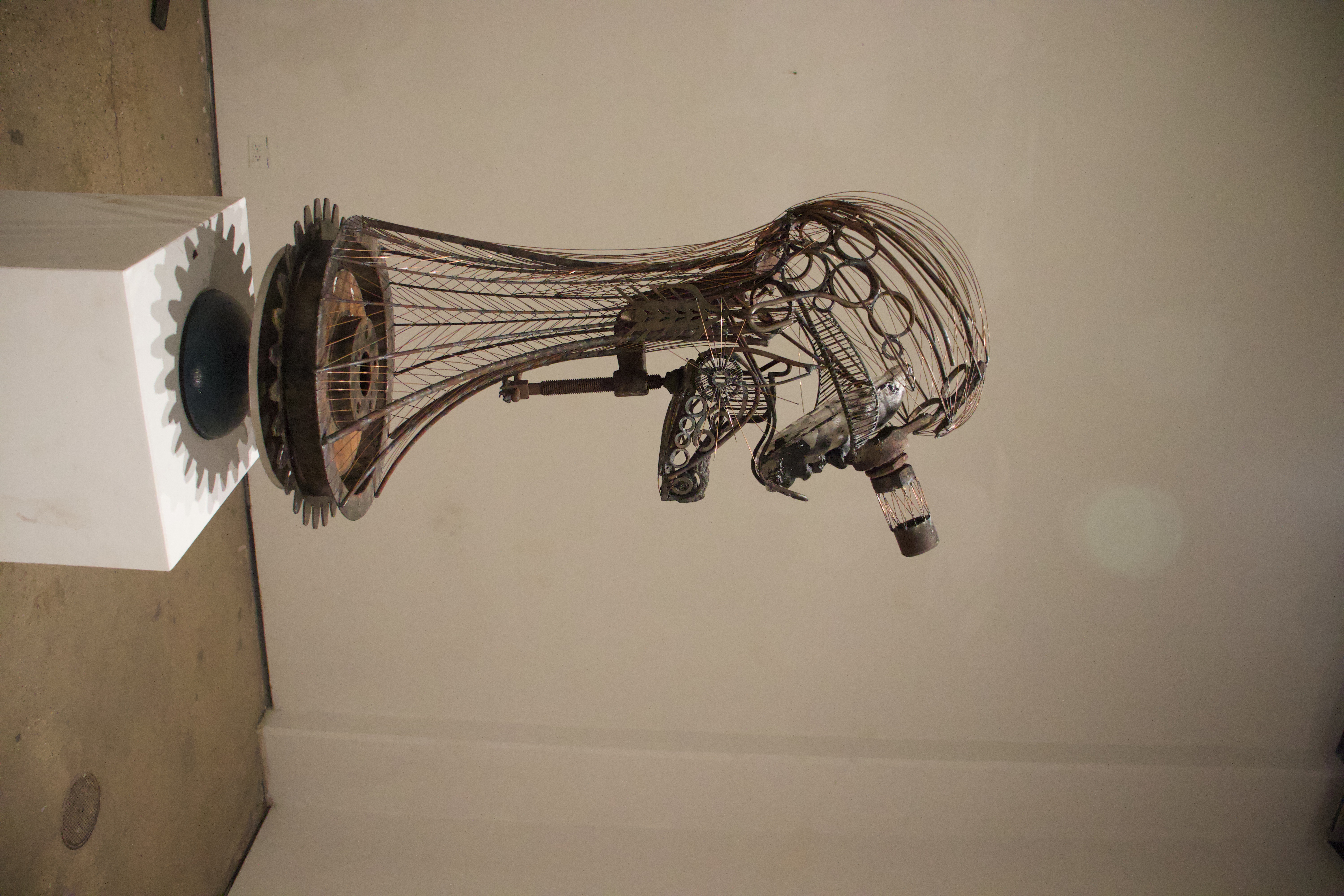 This piece considers origin as engineered form. A steel armature rises from a circular base and supports a suspended head constructed from welded rings, rods, and cast material. The structure remains exposed, with every joint and seam visible.