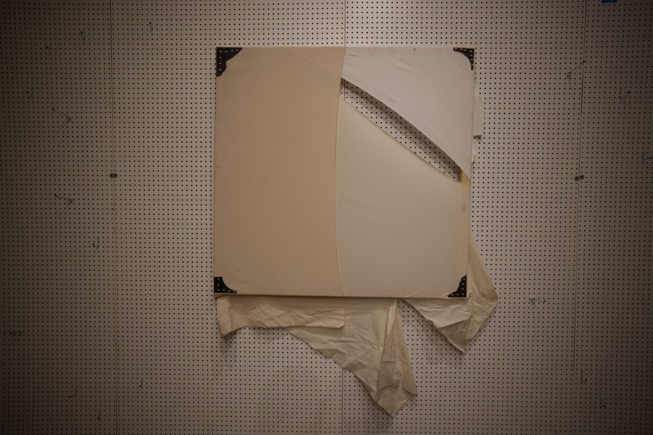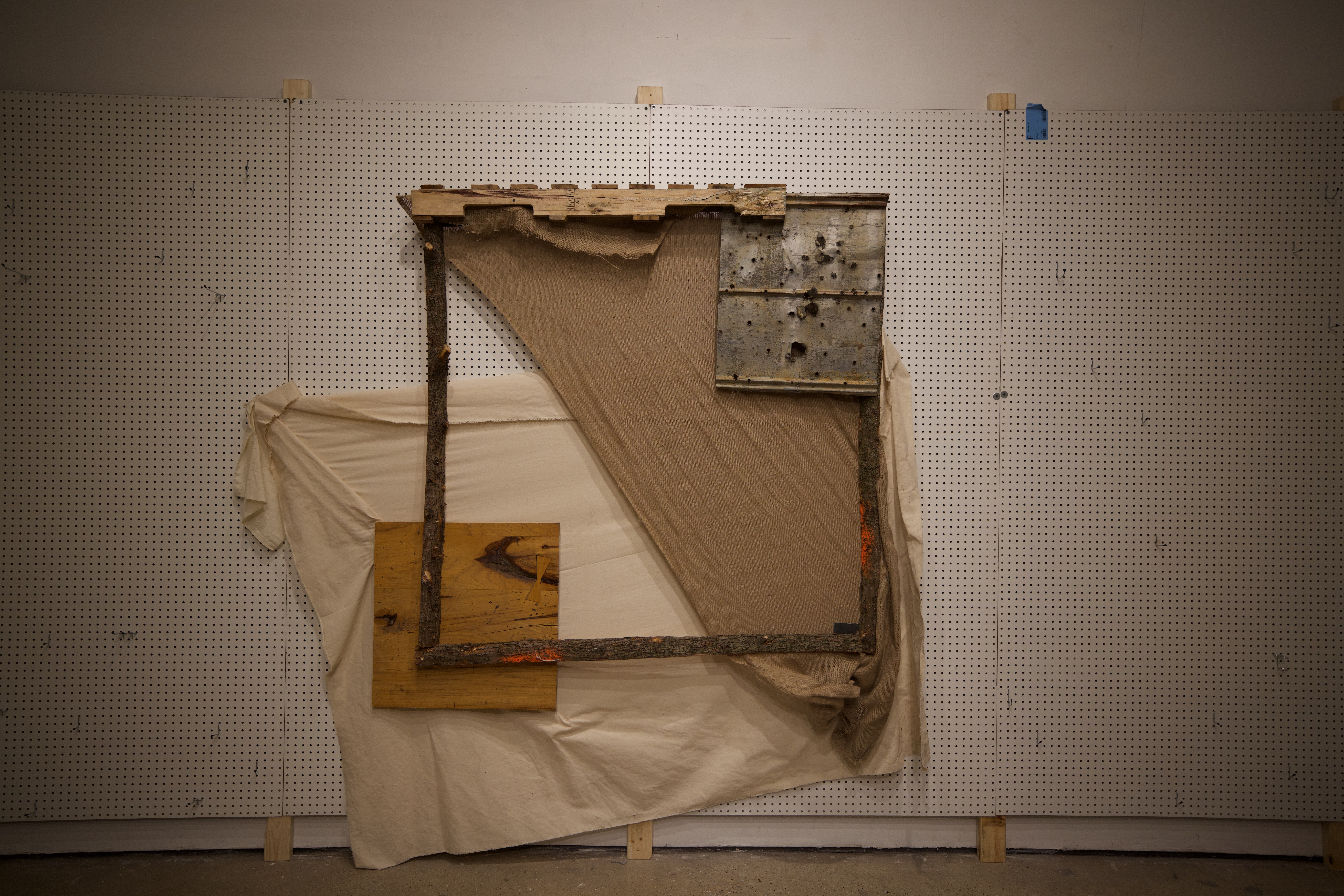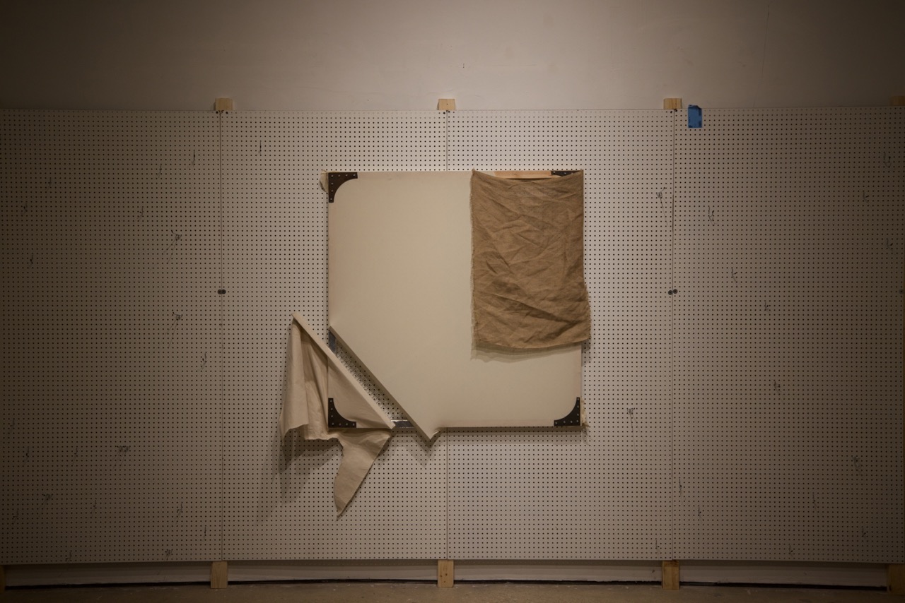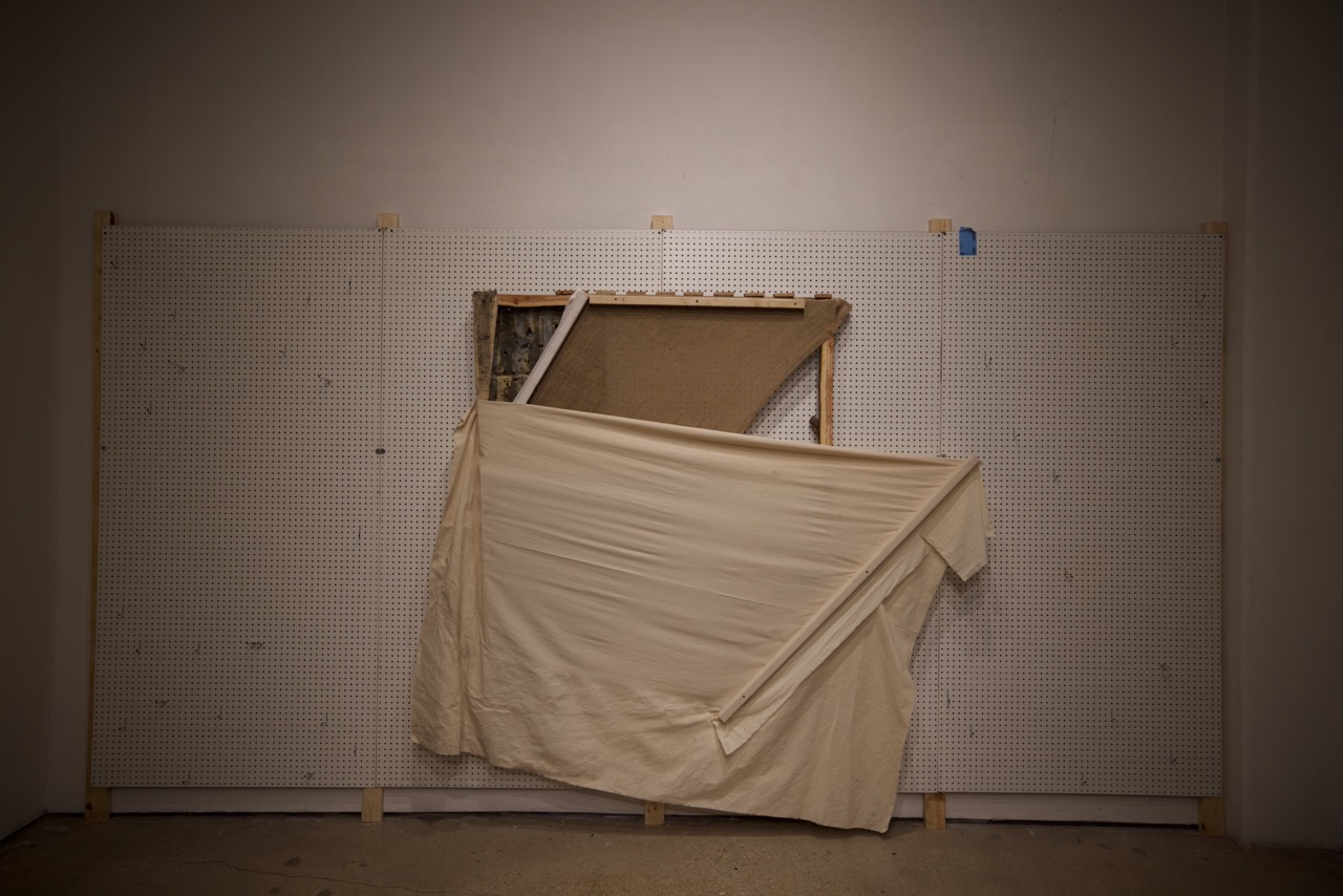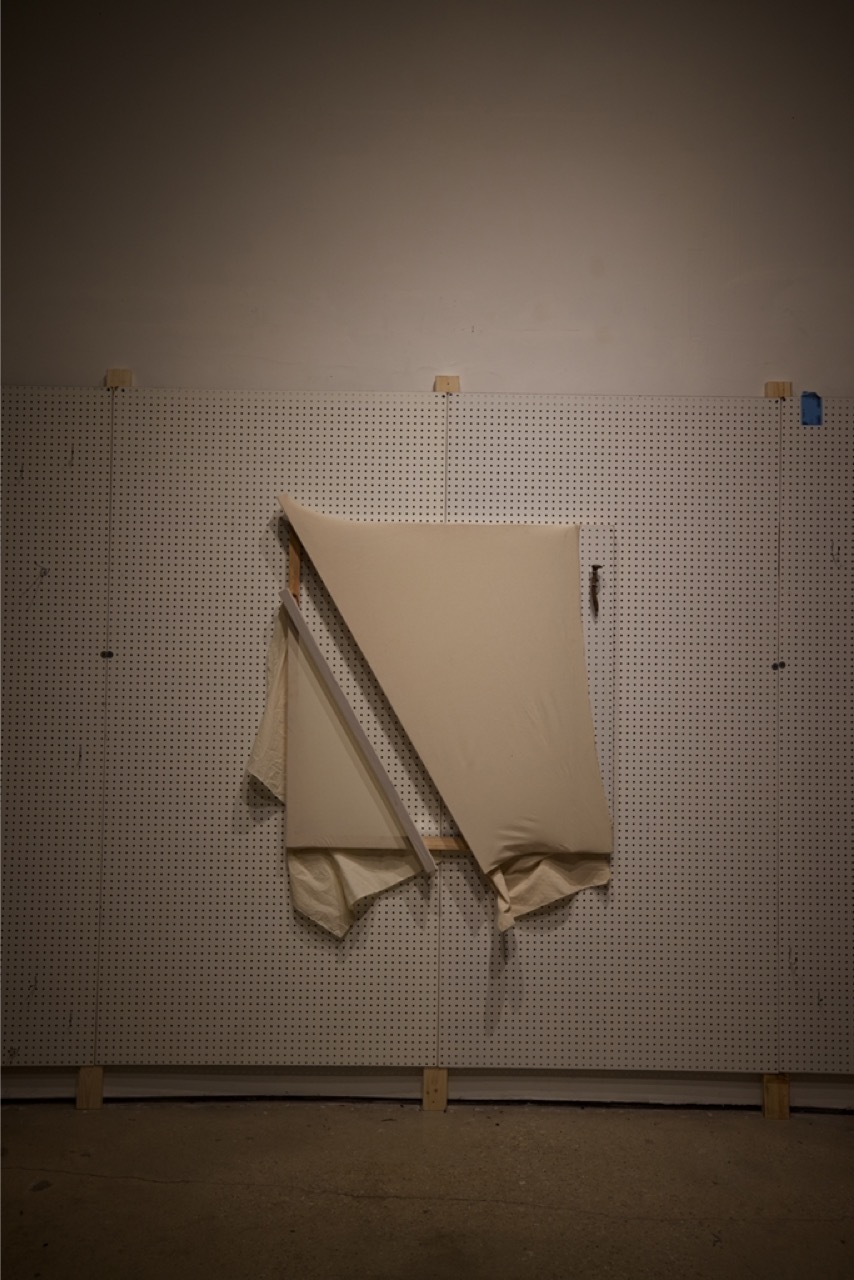Fabricated from cotton canvas, burlap, reclaimed lumber, perforated steel, and industrial brackets, the works were assembled through partial disassembly. Standard stretcher frames were cut, rotated, or stripped to reveal their internal grid. Fabric was left unprimed and allowed to crease under gravity. Hardware remains visible to emphasize attachment as gesture and exposure as method.