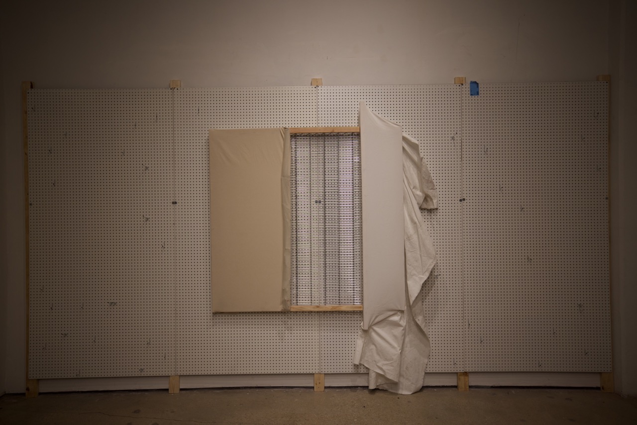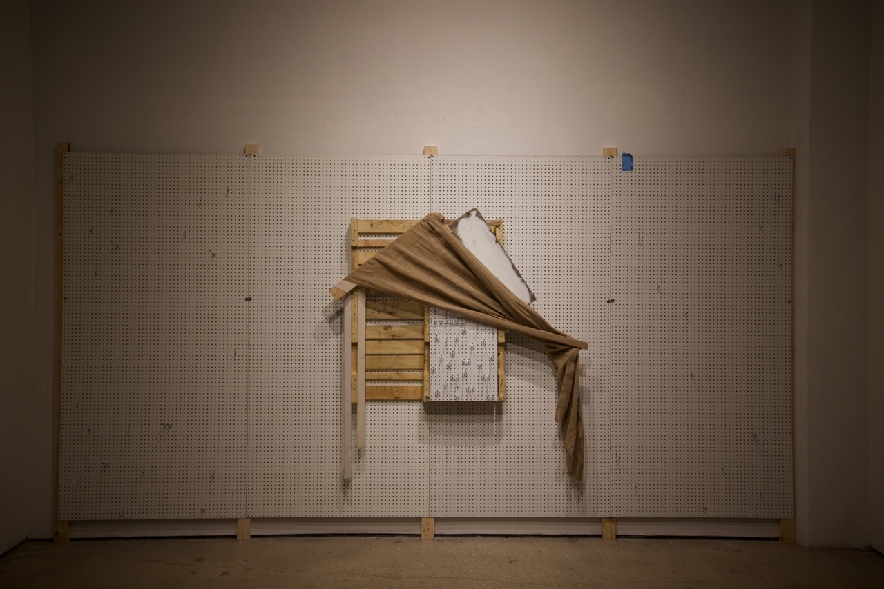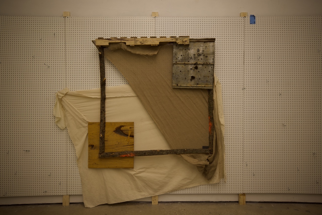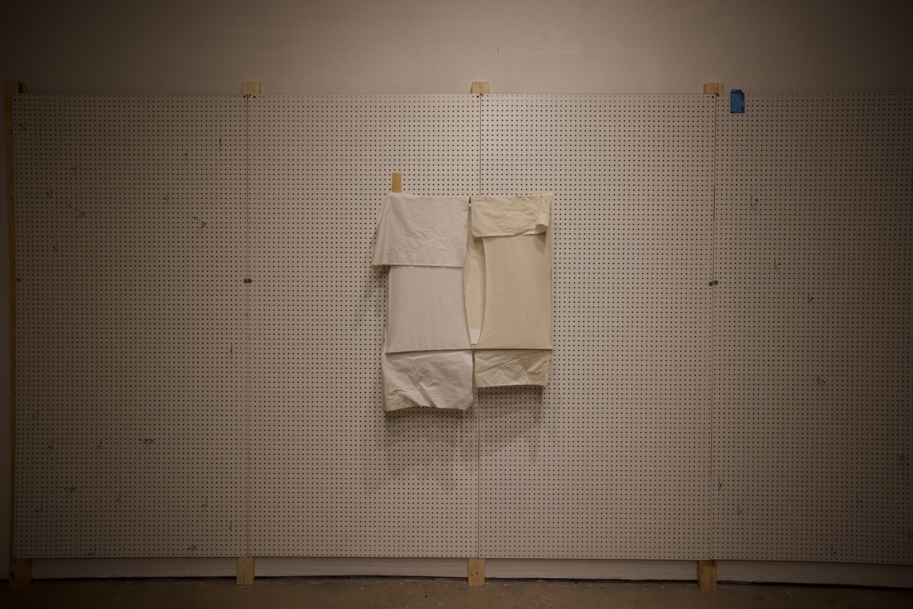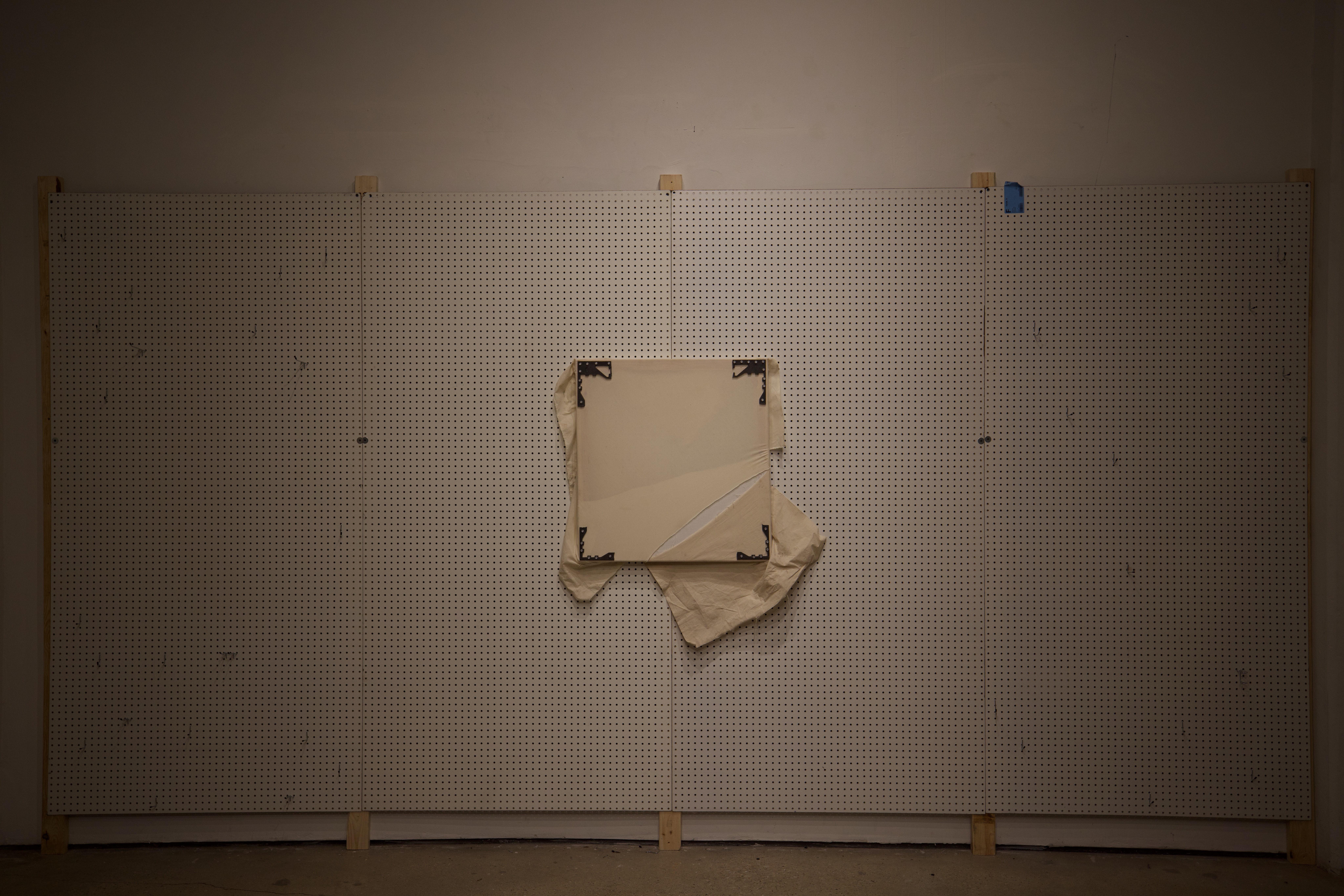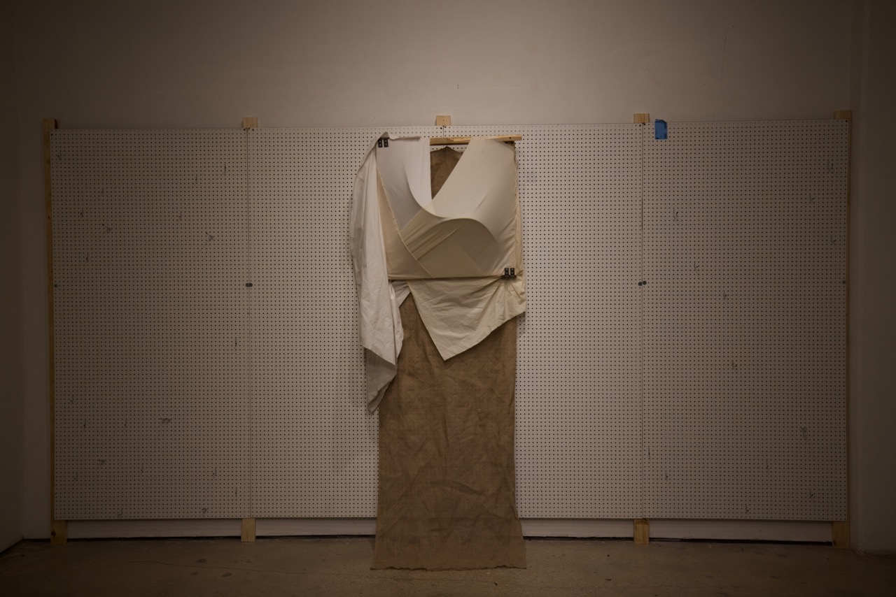 Fabricated from cotton canvas, burlap, reclaimed lumber, perforated steel, and industrial brackets, the works were assembled through partial disassembly. Standard stretcher frames were cut, rotated, or stripped to reveal their internal grid. Fabric was left unprimed and allowed to crease under gravity. Hardware remains visible to emphasize attachment as gesture and exposure as method.